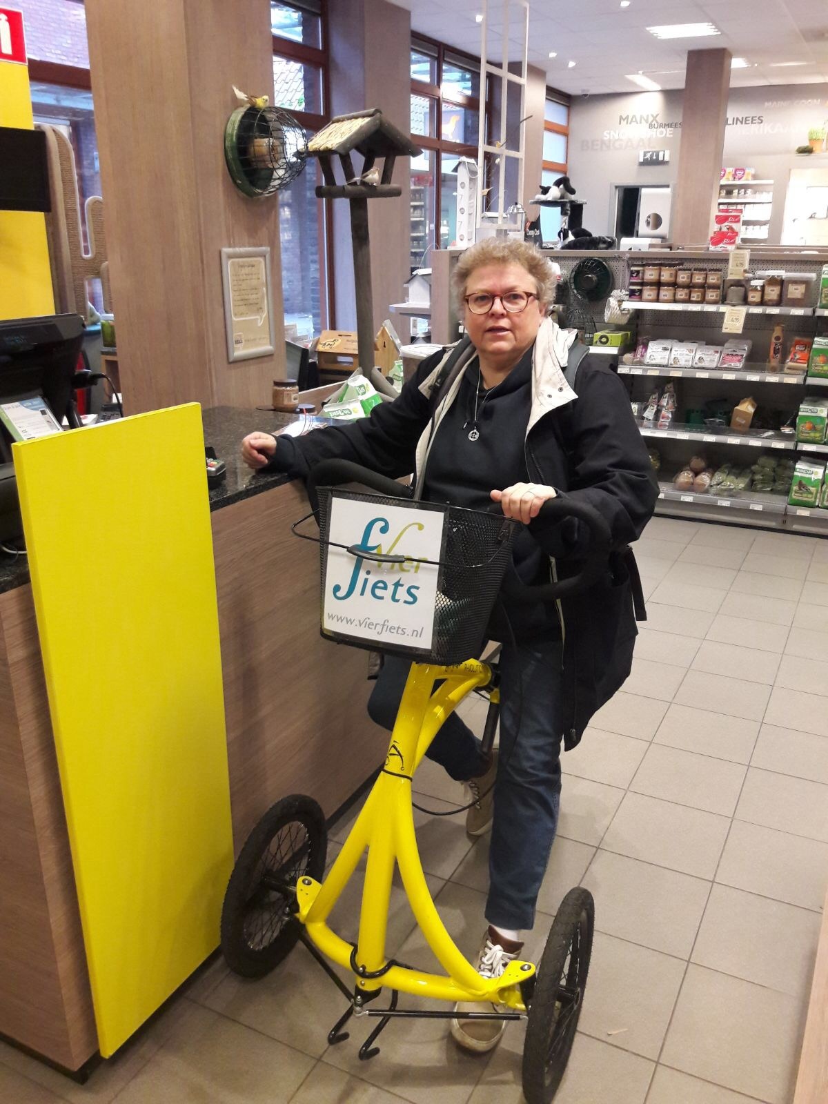 Well, a few weeks ago I saw a bright yellow balance bike at the physiotherapist’s. Wow, the color made it impossible to miss, but it also meant my attention kept wandering back to that bike. I carefully asked what it was used for and if I could perhaps try it out. Sure enough, I could, and boy, was it wonderful. I zipped through the exercise room (there was no one else on the floor, mind you…) without having to put any weight on my feet and with perfect balance. Well, I can actually say I was sold. A bit premature, of course, but then again, that’s kind of how I am. Uninhibited, especially according to others, haha. I enthusiastically started Googling (is that “plural” for “searching on Google”?) and found Vierfiets in Amersfoort. At Sjoukje Ziel’s, to be precise. And just as energetically as I’d started my search, I decided to give her a call as well. That was a pleasant conversation, and she had a size Small I could rent for a week. Great, right? When? Well, tomorrow then? Yeah, fine. Okay, so Saturday morning I found myself at Vierfiets in Amersfoort. A warm welcome. I noticed passion and expertise. I was given plenty of opportunity to ask questions; she wanted to know everything to give me sound advice. Like, is a Small my right size? What kind of handlebars would I like? Should I fit a basket? And so on. I tried everything out, and after about an hour and a half, I was off back to Tilburg, as proud as a peacock.